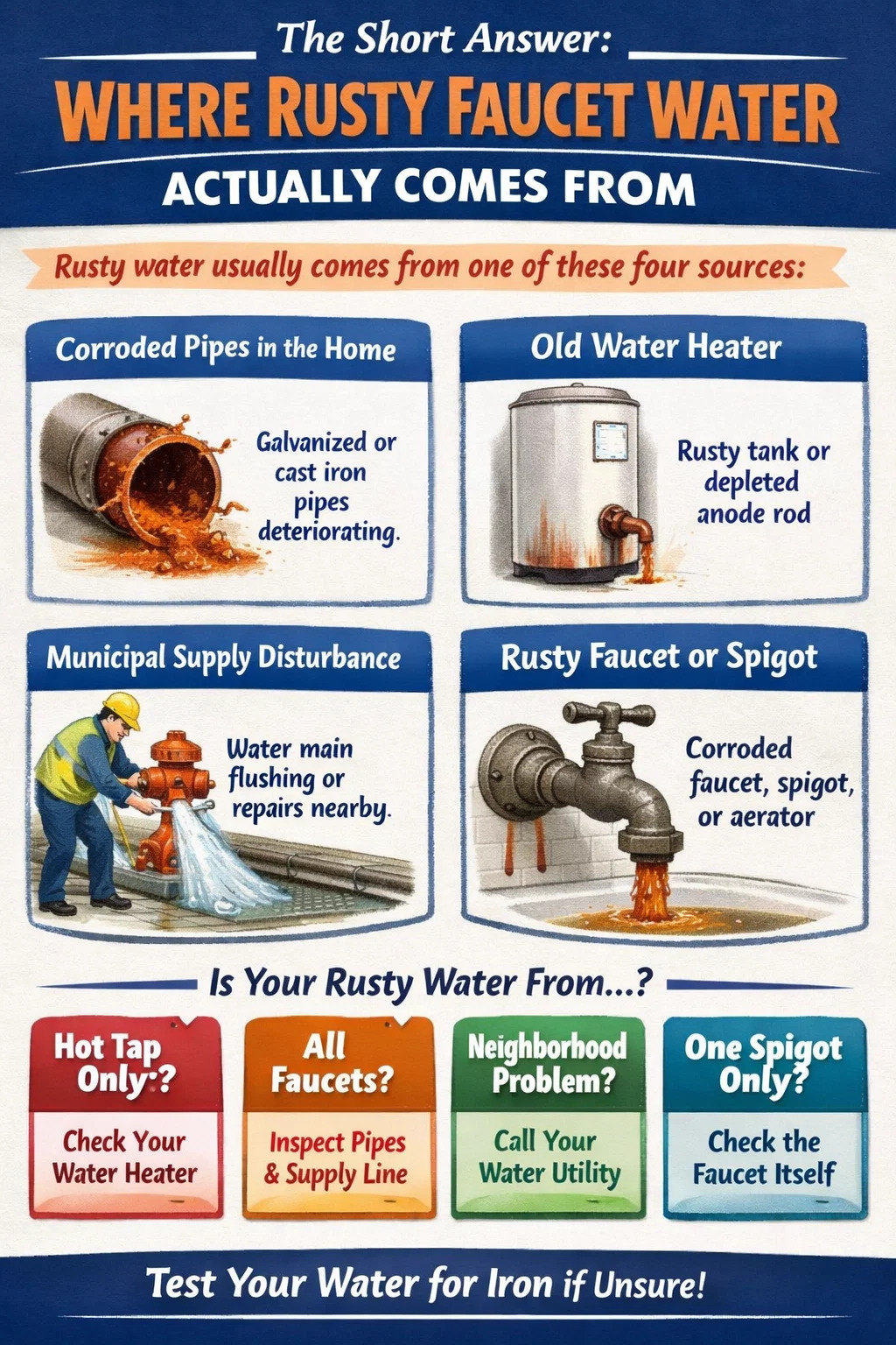 L'eau rouillée des robinets est presque toujours causée par l'une des quatre sources suivantes : des tuyaux en fer ou en acier corrodés à l'intérieur de votre maison, un chauffe-eau détérioré, une perturbation des sédiments dans la conduite d'alimentation municipale ou un robinet ou un luminaire oxydé au point de livraison. La teinte orange, brune ou rougeâtre que vous voyez est de l'oxyde de fer – la rouille – qui s'est écaillé de l'intérieur des tuyaux et est entré dans le cours d'eau, ou s'est dissous directement dans l'eau lors de son passage à travers une infrastructure vieillissante.