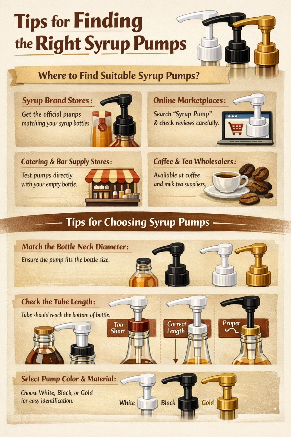 Comment les trouver : La méthode la plus sûre consiste à vérifier la marque du sirop que vous possédez. La plupart des marques de sirop connues (telles que les grandes marques de sirop de café) possèdent leurs propres pompes à sirop spécialement conçues.