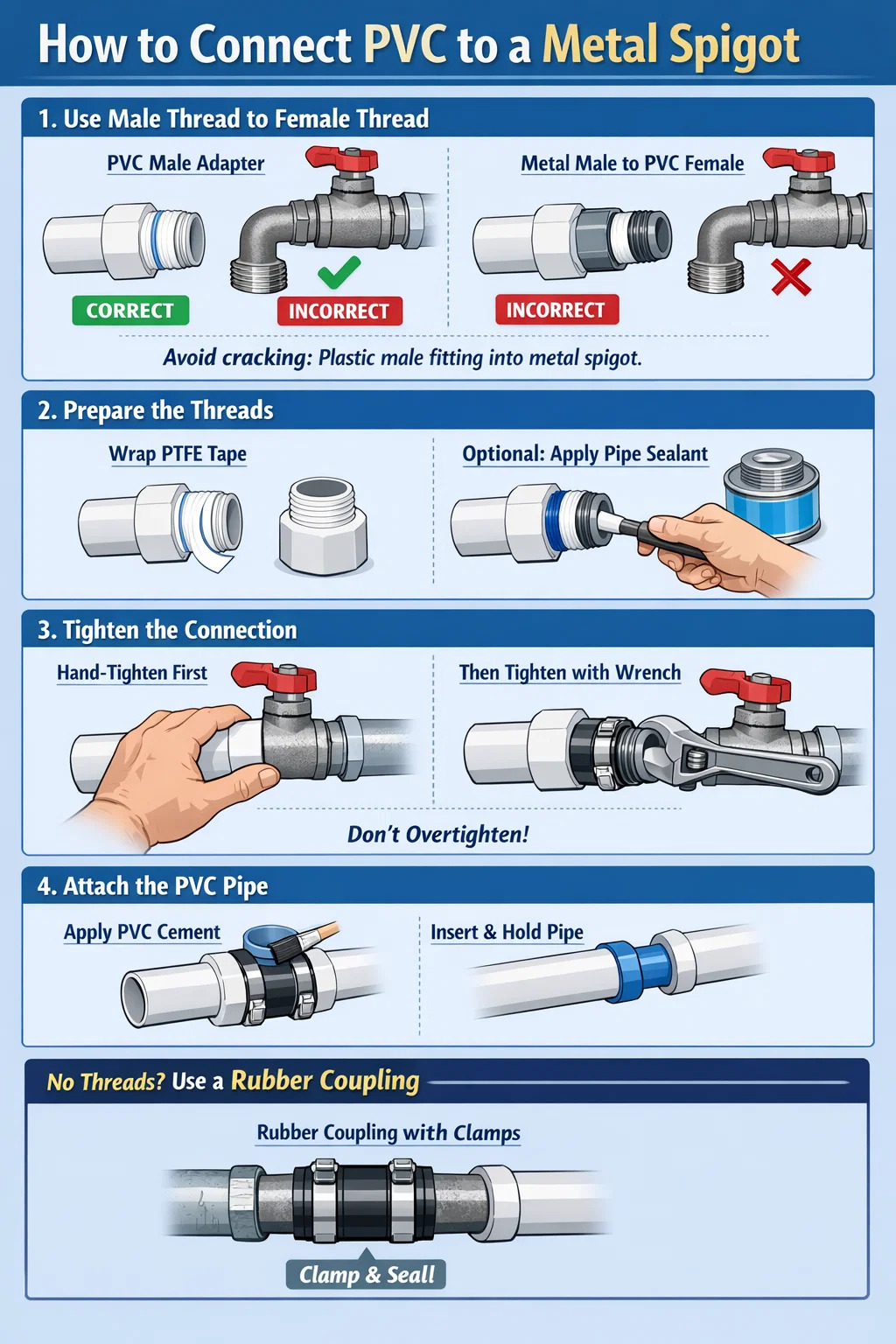Connecter des tuyaux en PVC à un robinet métallique (robinet ou vanne métallique) est une tâche courante lors des réparations de plomberie domestique. En raison des différences de dureté et de taux de dilatation/contraction thermique du plastique et du métal, un soin particulier est nécessaire lors du raccordement pour éviter les fuites ou les raccords fissurés.