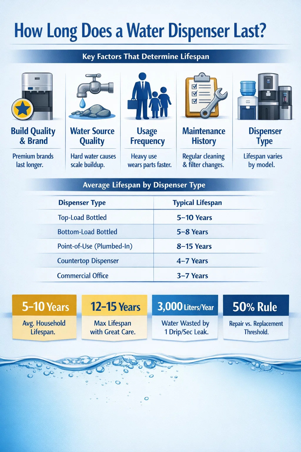 | Distributeur de comptoir | 4 à 7 ans | Fissuration du robinet, fuite du réservoir |