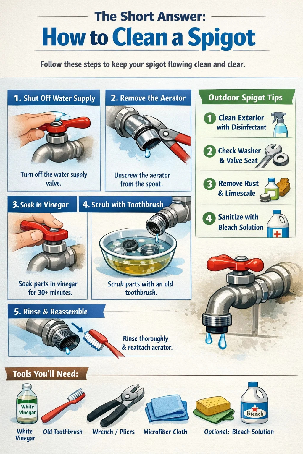 Ce guide couvre tout : les outils dont vous avez besoin, comment nettoyer différents types de robinets, comment traiter les dépôts minéraux tenaces, comment désinfecter les robinets extérieurs et comment entretenir votre robinet pour qu'il dure plus longtemps.