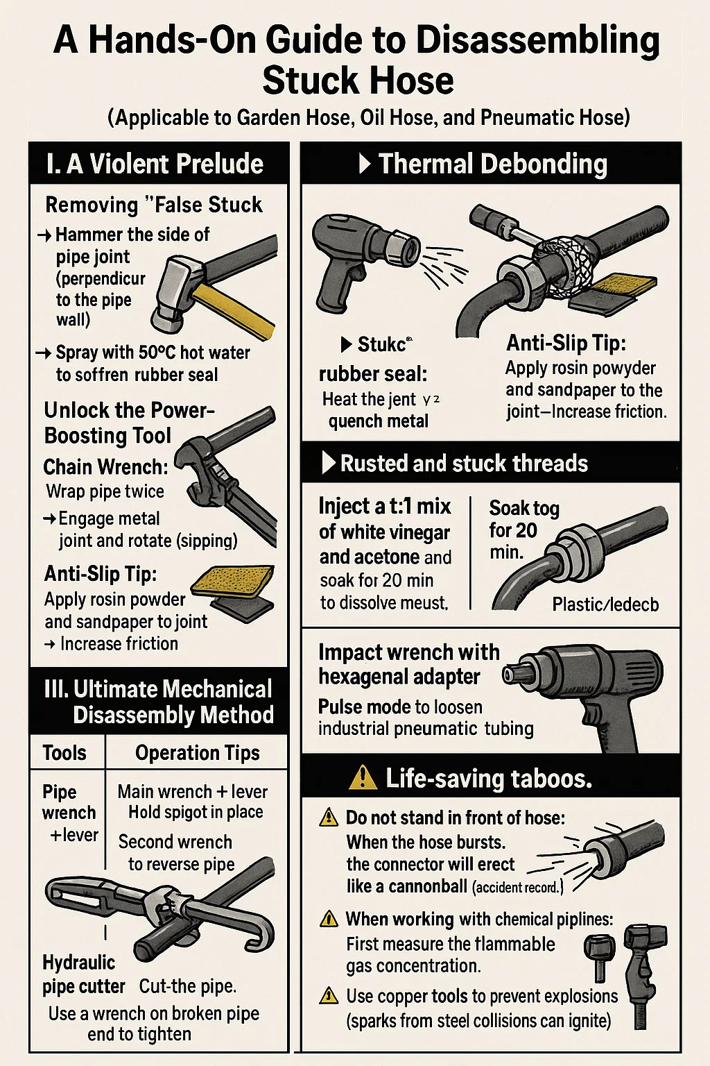 | Coupe-tube hydraulique | Couper le tuyau → Bloquer l'extrémité coupée sur l'entraînement de la clé → Tirer parti du moignon pour la rotation | Tuyaux en plastique/caoutchouc | Coupez 2" du raccord – maximise la surface de préhension |