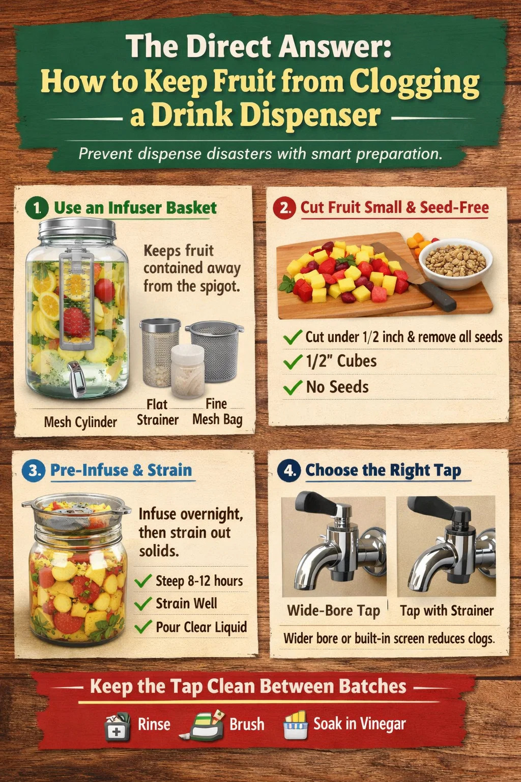 Une étape souvent négligée : retirez toujours les graines avant d'ajouter des agrumes ou des fruits à noyau . Une seule graine de citron logée dans un robinet de distributeur de boissons en métal peut réduire le débit à un filet en moins de cinq minutes d'utilisation.