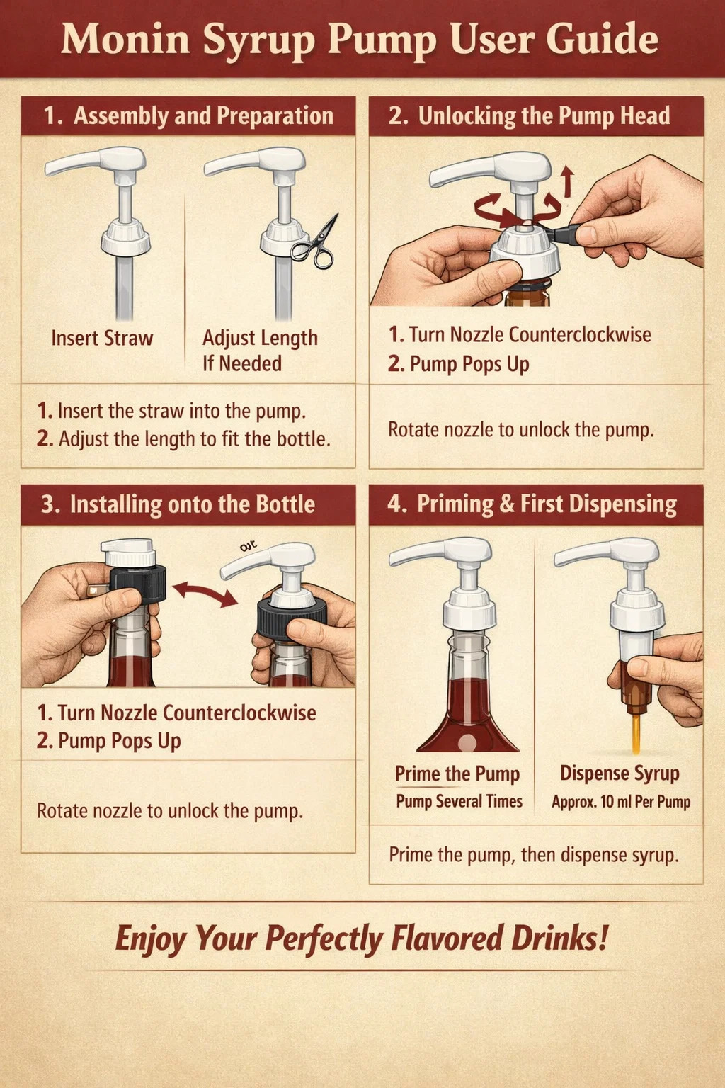 Pour la pompe à sirop Monin, un outil de bar classique, son utilisation correcte rendra la préparation de votre boisson plus fluide et préservera mieux la qualité du sirop.