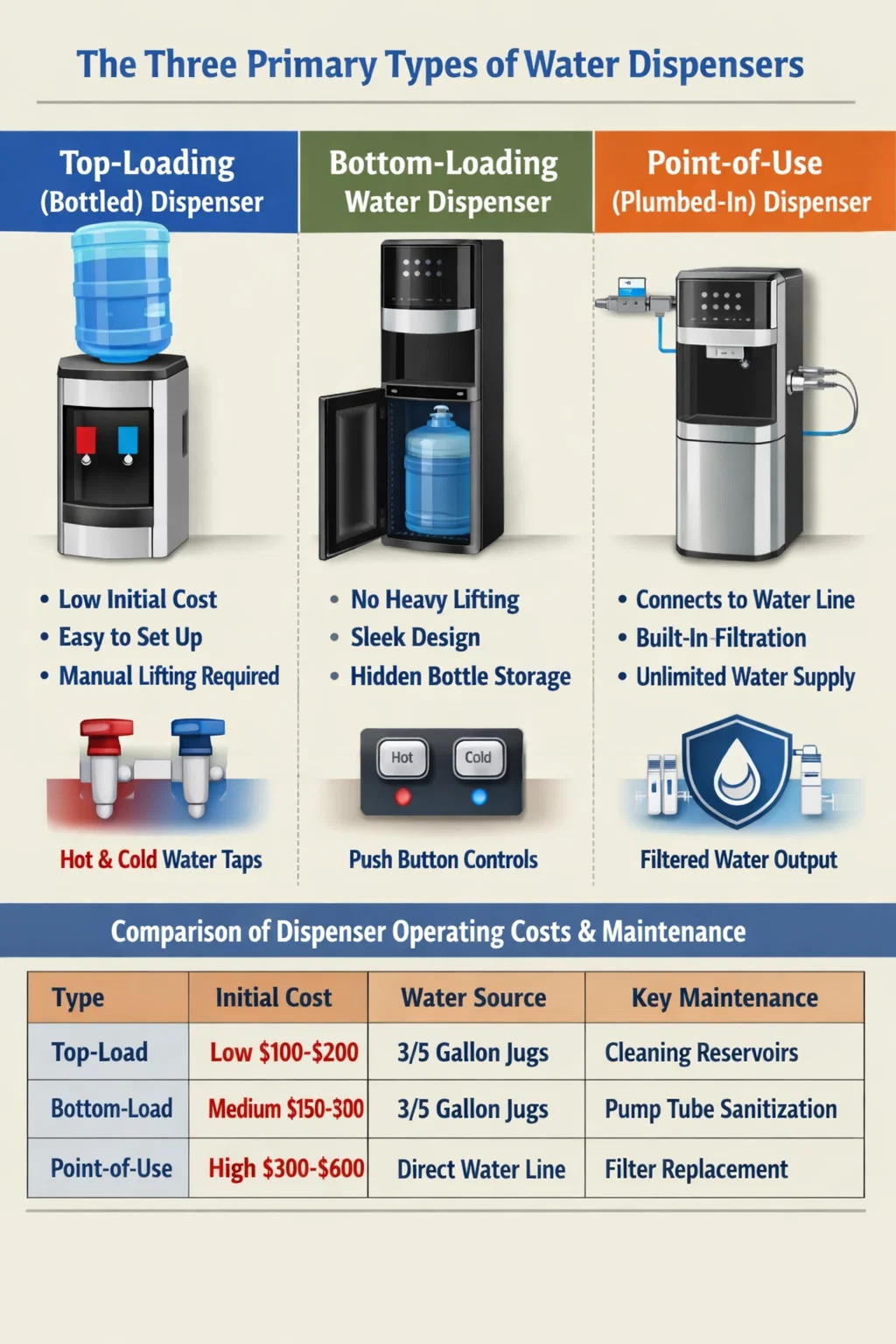 Lors de l’évaluation des solutions d’hydratation pour une maison ou un bureau, les distributeurs d’eau sont généralement classés en trois types distincts en fonction de leur mécanisme de chargement et de leur source d’eau : Distributeurs à chargement par le haut (en bouteille), distributeurs à chargement par le bas et distributeurs au point d'utilisation (plombés). Chaque système utilise un robinet distributeur d'eau configuration pour gérer le flux, et le choix de la bonne dépend de votre espace physique, de votre budget et du niveau de maintenance souhaité.