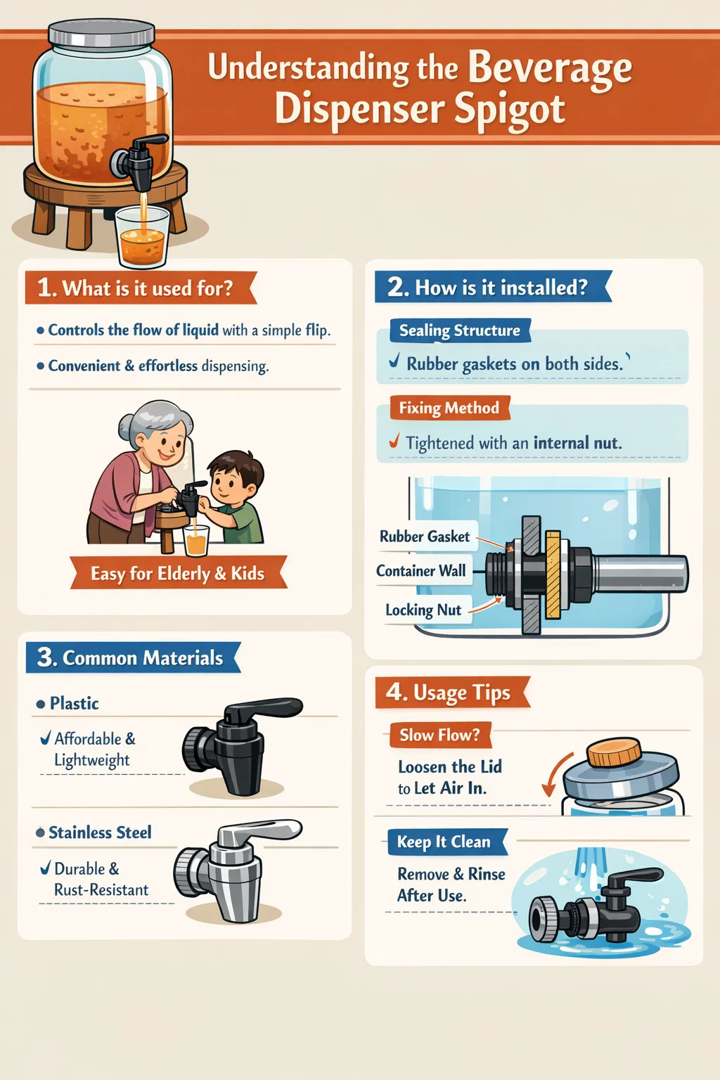 Un robinet de distributeur de boissons est le petit robinet ou la vanne installée au fond d'un récipient à boisson ou d'un réservoir d'eau. C'est le cœur de tout le conteneur ; sans cela, il faudrait soulever le lourd récipient pour verser le liquide.