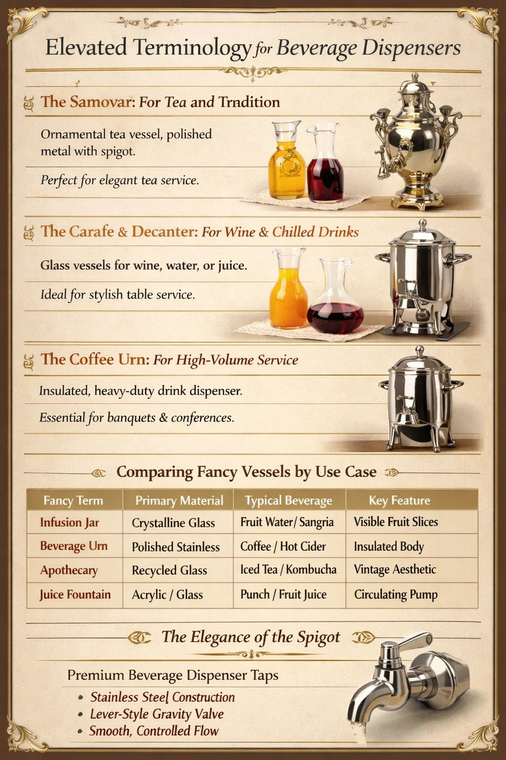 Si vous recherchez un mot sophistiqué pour désigner un distributeur de boissons, les termes les plus précis dépendent de la conception et du contexte spécifiques du récipient. Pour des réunions sociales élégantes, les conditions "Carafe", "Carafe", "Samovar" ou "Urne" sont fréquemment utilisés. Dans la restauration professionnelle et l'hôtellerie haut de gamme, ces articles sont souvent appelés "Carafes à jus" ou «Pots à infusion». Unlous qu'une unité standard est fonctionnelle, une version haut de gamme dotée d'un robinet de distributeur de boissons transforme un simple conteneur en une pièce maîtresse de l'équipement de service.