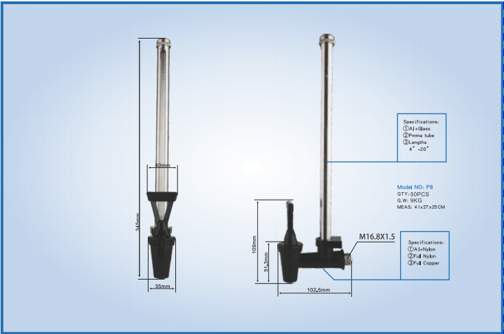 Le tube de visée, le robinet, la rondelle et l'écrou sont tous fabriqués avec un matériau sans BPA. La protection extérieure du tube est en aluminium léger. Ils confèrent à l’ensemble du produit une structure plus solide, durable et sans danger pour la consommation.
